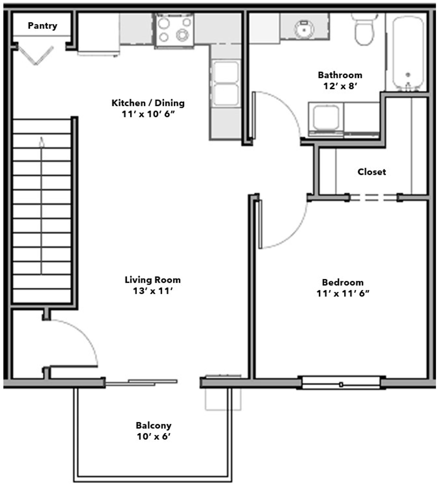 Enjoy private, direct access to your apartment via staircase! Large balcony located off living room area.