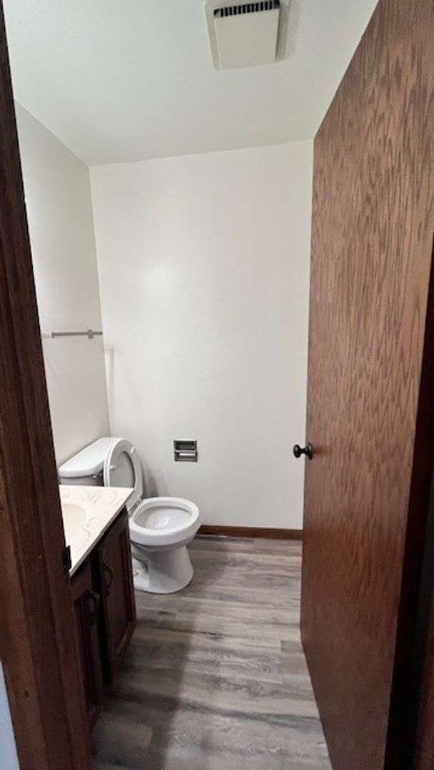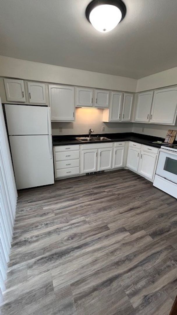 Inside, you’ll find approximately 900 square feet of thoughtfully designed living space, featuring fresh paint and stylish vinyl plank flooring throughout for a clean, modern feel. The kitchen comes equipped with a stove and refrigerator, making move-in simple and stress-free. The home also includes a washer and dryer hook-up in the basement along with additional storage space to help keep everything organized.